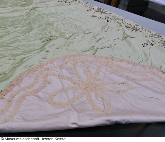 An der linken Längskante der Schleppe sind drei breite, cremefarbene Atlasbänder angenäht, die Spuren von drei Nahtstellen (resedagrüner Faden) aufweisen. Auf der Unterseite der Schleppe sind auf der rechten Längsseite und an jeweils zwei Stellen dazwischen ebenfalls Nahtspuren vorhanden. Möglicherweise wurde die Schleppe damit etwas zusammengerafft bzw. konnte mit diesen Querbändern aufgenommen und über den linken Arm gelegt werden.