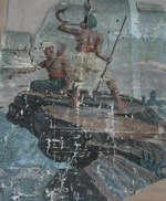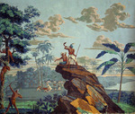 Panoramatapete "Grande Chasse au Tigre dans l'Inde" ("Vues de l'Inde"), Bahn 0-5 (Blick auf Ganges mit Tempel), Bahn 6-9 (Jagdszene)