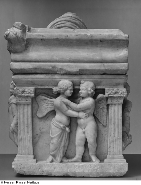 Das unheilabwehrende Gorgoneion soll den Toten beschützen. Seine zentrale Position und das Motiv der clipeushaltenden Eroten, das der römischen Staatskunst entlehnt ist (Andreae 1981), betonen seine Bedeutung. Die zahlreichen Erotendarstellungen innerhalb der Torre-Nova-Gruppe hängen wohl von attischen Vorbildern ab (Wiegartz 1965, 42; Koch – Sichtermann 1982). Auf dem Kasseler Exemplar enthalten sie in ihren Attributen Anspielungen auf Jahreszeitenzyklen und den dionysischen Thiasos (Andreae 1981). Sie drücken die Hoffnung auf ein glückliches Weiterleben im Jenseits aus (Koch 1993, 57). Im Kontext der Ostothek werden sie auch als Sinnbild der Liebe interpretiert, die den Tod überdauert (Andreae 1981).