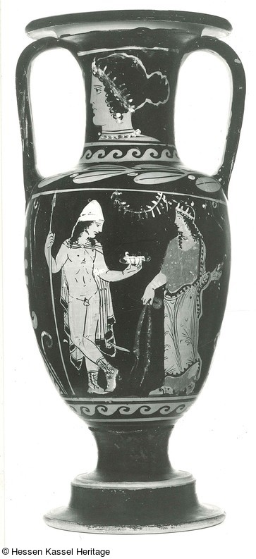 Das Vorratsgefäß hat einen schlanken, eiförmigen Körper mit abgeflachter Schulter und langem Hals. Über einem scharfen Knick, an welchen die gekehlten Bandhenkel herangeführt sind, liegt der breite, scheibenförmige Mündungsteller. Der nicht zugehörige Fuß besteht aus einem tellerförmigen Standring mit zylindrischem Aufsatz, der die bikonkave Verbindung zum Körper trägt. Körper, Schulter und Hals sind figürlich bemalt; tongrundige Linien trennen die Dekorzonen; unter dem Bildfeld unten befindet sich ein rechtsläufiges Wellenband (,laufender Hund') bei schwarzfiguriger Lesart, oben auf dem Hals ein ebenfalls rechtsläufiges bei rotfiguriger Betrachtungsweise. Auf (A) steht links ein fast nackter Jüngling in Vorderansicht mit gekreuzten Beinen. Der vor der Brust geschlossene Mantel (Chlamys) hängt von den Schultern auf den Rücken und seitlich herab. Der Jüngling trägt Schnürstiefel und einen hellen, konischen Filzhut (Pilos); mit der Rechten stützt er sich auf eine Lanze und betrachtet die gerippte, mit Eiern (?) gefüllte Schale (Phiale), die er mit der Linken einer Frau entgegenhält, welche von rechts in braunlilafarbenem Chiton und Mantel, geschmückt mit Halskette, Armband und Haarschmuck (Stephane) auf ihn zukommt. Sie hält in den Händen Schmuckbinde (Tänie), Kranz und einen weißen Vogel. Über ihnen hängen Blattgirlande und Binden. Auf (B) stehen zwei bekränzte Jünglinge in Mänteln beieinander; jeder hält einen Stab in der Hand (oder spielt der linke mit einer Kugelkette?); hinter ihnen hängt je eine Binde. Unter den Henkeln ist jeweils ein doppeltes Palmetten-Ranken-Ornament, auf der Gefäßschulter ein Lorbeerzweig mit Früchten und auf dem Hals je eine weibliche, geschmückte Büste im Profil nach links wiedergegeben.