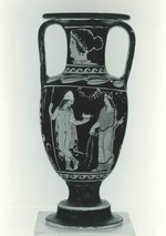 Das Bild auf (A) gibt wahrscheinlich die Begegnung des Orest und der Elektra wieder, die mit Bezug auf die Tragödie Choephoroi des Aischylos in der Regel am Grab Agamemnons dargestellt wurde. Szenen des griechischen Theaters sind ein bevorzugtes Motiv der unteritalischen Vasenmalerei. Das Thema Manteljünglinge im Gespräch ist seit der attischen Vasenmalerei des 5. Jhs. v. Chr. für Gefäßrückseiten geläufig. Der Python-Maler ist neben Asteas der wichtigste Vasenmaler der paestanischen Keramik.