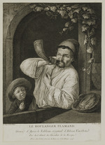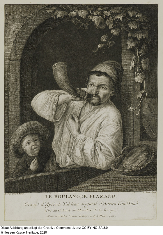 Beschriftungen: in der Platte: A. Van Ostad Pinx.; P. Chenu Sculp.; LE BOULANGER FLAMAND. Gravé d'Après le Tableau original d'Adrien Van Ostad. Tiré du Cabinet du Chevalier de la Rocque. AParis [ligiert] chez Lebas, Graveur du Roy, rue de la Harpe. 1743.;