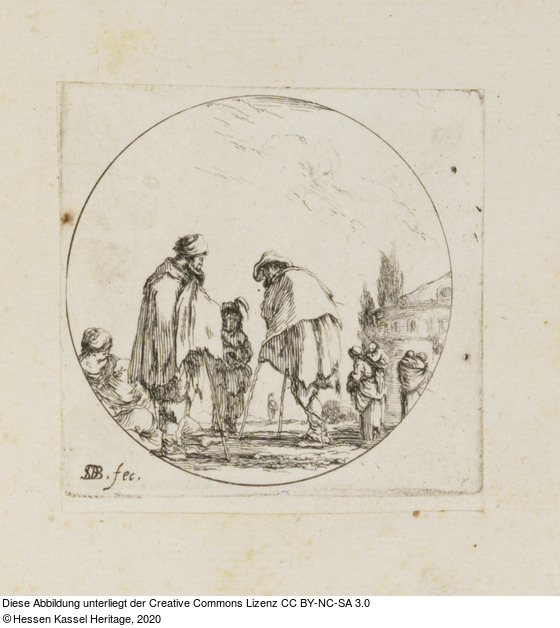 | nach Werkverzeichnis: | Un gueux marchant avec des béquilles et parlant avec un Turc. Plus loin, quelques figurines. |