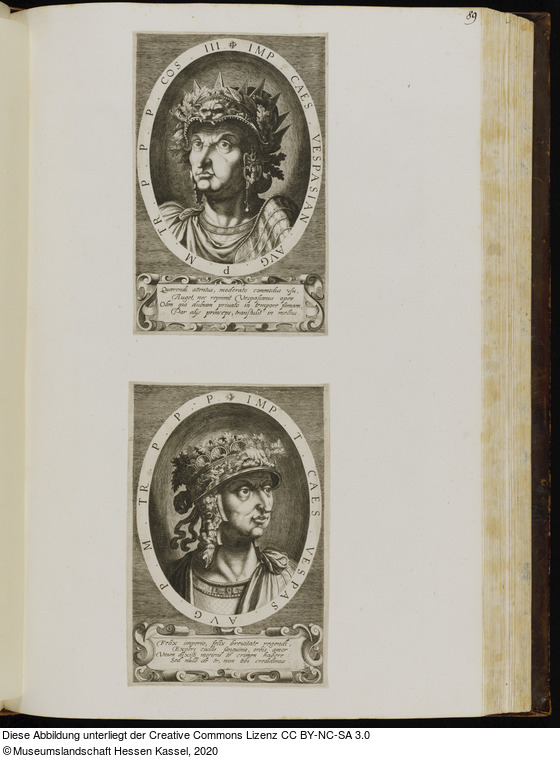 | Hist. Inhaltsverzeichnis: | 89. | Vespasianus / Titus Vespasianus. in rundem Format mit den Namens Inschriften; unter / jedem 4. lat: Verse. |