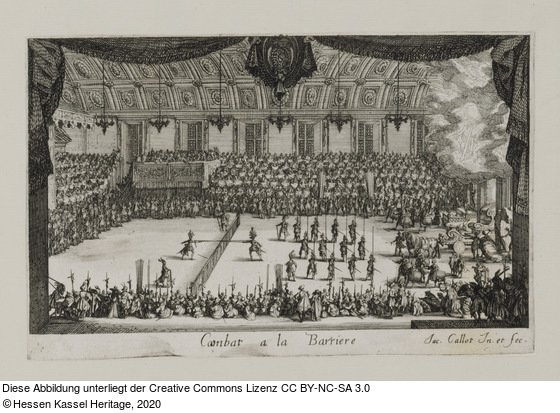 Die Radierung wurde als Illustration geschaffen für die Schrift "Le combat à la barrière" von H. Humbert (Nancy, Sébastien Philippe, 1627), welche die Festlichkeiten zu Ehren der Herzogin von Chevreuse am 14. Februar 1627 in Nancy beschreibt. |