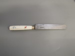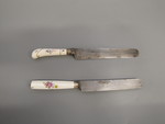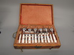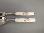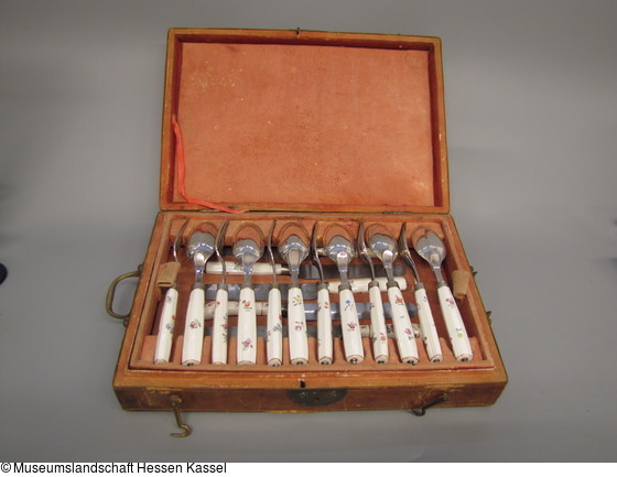 Kasten: Holz, Leder, Textil; Besteck: Messer Stahl, Porzellan, Aufglasurmalerei, Goldstaffage, Silber. Gabel und Löffel: Silber, Porzellan, Aufglasurmalerei, Goldstaffage |