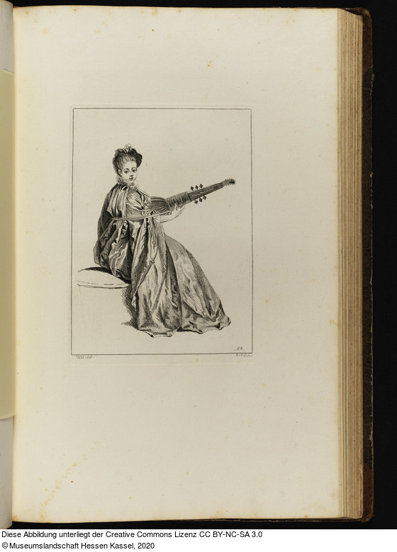Nach einer Zeichnung von Antoine Watteau. Die Radierung ist Teil des ersten Bandes der "Figures de differents caracteres [...]", der erstmals 1726 von Jean Audran und François Chéreau herausgegeben wurde. |