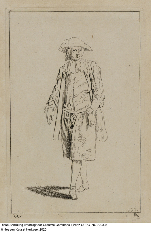 Nach einer Zeichnung von Antoine Watteau. Die Radierung ist Teil des zweiten Bandes der "Figures de differents caracteres [...]", der erstmals 1728 von Jean Audran und François Chéreau herausgegeben wurde. |