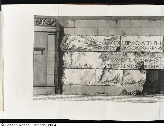 Beschriftungen: in der Platte: Tom. II. V; C PO[...]CIO L F ... BLICE DATVS EST; Si dimostrano più in grande ... Opera mia di Archit.ra; Piranesi Archit. dis. et inc.;