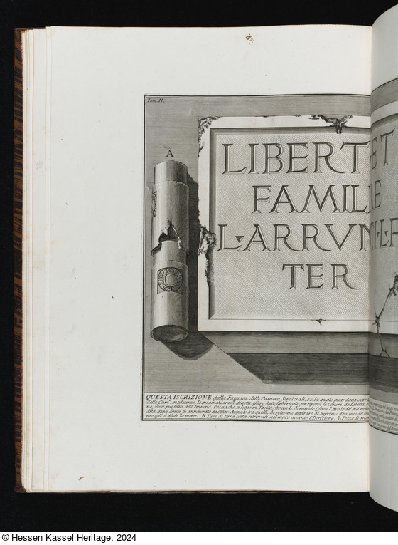 Beschriftungen: in der Platte: Tom. II. VI; LIBERT ET FAMILIAE L ARRVNTI L F TER; ANTISTI OP DOLIARE; QUESTA ISCRIZIONE dalla Facciata delle Camere Sepolcrali ... le Ceneri dei defonti.; Piranesi Archit. dis. ed inc.;