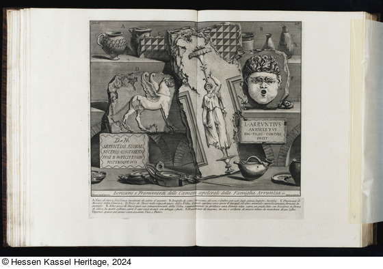Beschriftungen: in der Platte: Tom. II. XIV; D M ARRVNTIAE FLORAE ... FILIO CONIVGI FECIT; Iscrizioni e Frammenti delle Camere sepolcrali della Famiglia Arrunzia ec.; Piranesi Archit.o dis. ed inc.; Barbault scolp. le Fig.; A Vasi di terra finissima ... Lucerne, vasi, e Patere.;
