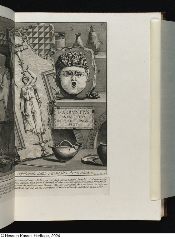 Beschriftungen: in der Platte: Tom. II. XIV; D M ARRVNTIAE FLORAE ... FILIO CONIVGI FECIT; Iscrizioni e Frammenti delle Camere sepolcrali della Famiglia Arrunzia ec.; Piranesi Archit.o dis. ed inc.; Barbault scolp. le Fig.; A Vasi di terra finissima ... Lucerne, vasi, e Patere.;