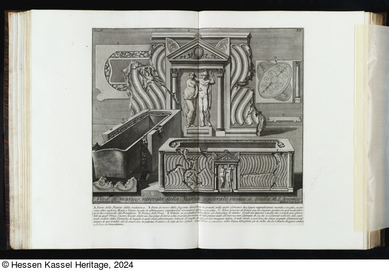 Beschriftungen: in der Platte: Tom. II. XX; Vrna di marmo, ritrovata nella Stanza sepolcrale vicina a quella di L.Arrunzio; Piranesi Architetto dis. ed inc.; Barbault scolpi le figure; A Parte della Pianta delle medesima. ... S. Croce in Gerusalemme;