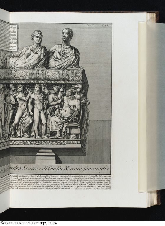 Beschriftungen: in der Platte: Tom. II. XXXIII; Il Sig.re Abate Venuti ... o sia ultima aggiunta al Tomo IV; Grand' Urna di marmo, creduta di Alessandro Severo, e di Giulia Mamea sua madre; Questa grand' Urna ... ed altri suoi ornamenti; Piranesi Archit. dis. ed inc. Barbault scolpì le figure;
