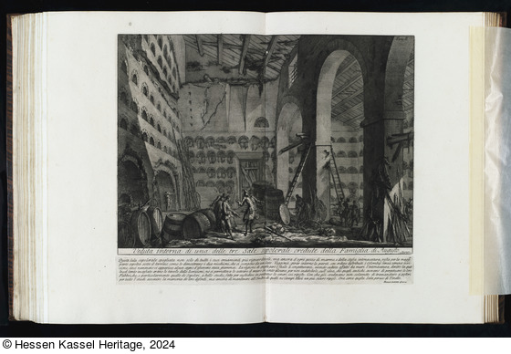 Beschriftungen: in der Platte: XLII Tom. II.; Veduta interna di una delle tre Sale sepolcrali credute della Famiglia di Augusto.; Piranesi Archit. dis. e inc; Questa Sala sepolcrale spogliata ... questa Sala peruso di Tinello.; Piranesi Architetto dis. ed inc.;