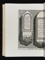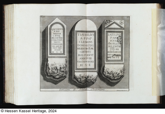 Beschriftungen: in der Platte: Tom. II. LI; QACONIVS F PVP MESSOR ... VIXIT ANNOS [...] TEIHSE; Iscrizioni de' Soldati Pretoriani; Piranesi Archit dis. ed inc.;
