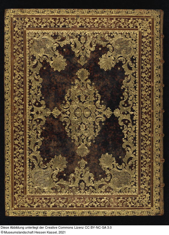 Kommentar: Der Ledereinband der Päpstlichen Chalkographie ist mit einer reichen Goldprägung versehen. Landgraf Friedrich II. erhielt den Band als Geschenk von Papst Pius VI. während seiner Reise nach Rom im Jahre 1777. Vgl. Splitter, Rüdiger: Forum Romanum. Zeitreise durch 3000 Jahre Geschichte, Petersberg 2014, S. 49. Zum Einband vgl. Schütte, Rudolf-Alexander; Wiedemann, Konrad: Einbandkunst. Vom Frühmittelalter bis Jugendstil. Aus den Bibliotheken in Kassel und Arolsen, Kassel 2002, S. 48, Nr. 55.