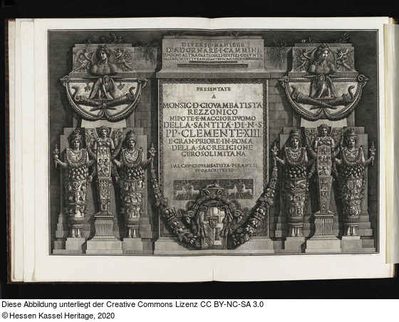 Beschriftungen: in der Platte: DIVERSE MANIERE D' ADORNARE I CAMMINI ... ETRUSCA GRECA E [...]; PRESENTATE A MONSIG. D. GIOVAMBATISTA REZZONICO NIPOTE E MAGGIORDVOMO DELLA SANTITA DI N S PP CLEMENTE XIII E GRAN PRIORE IN ROMA DELLA SAC RELIGIONE GEROSOLIMITANA; DAL CAV GIOVAMBATISTA PIRANESI SVO ARCHITETTO; Cavalier Piranesi inv. ed incise;