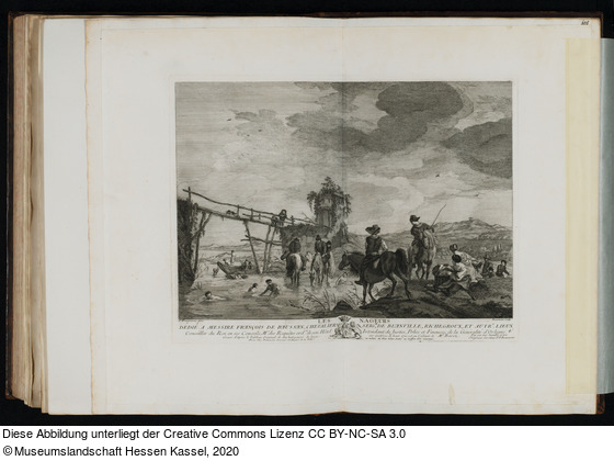 in der Platte: P. Wowermens pinx.; Beaumont Sculp.; LES NAGEURS; DÉDIÉ A MESSIRE FRANCOIS DE BAUSSAN, CHEVALIER SEIGR, DE BLANVILLE, RICHEGROUX, ET AUTRS. LIEUX Conseiller du Roi en ses Conseils, Me. des Requêtes ord.re de son Hôtel Intendant de Justice, Police et Finances, de la Géneralité d'Orleans. Par son très humble et très Obèißant Serviteur P. F. Beaumont.; Gravé d'Après le Tableau Original de dix huit pouces de large sur quatorze de haut. Qui est au Cabinet de Mr. Barez.; AP[ligiert]aris Chez Beaumont Graveur Ordinaire de la Ville au milieu du Pont Nôtre-Dame au Griffon d'Or Couronné.;