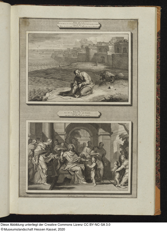 in der Platte: Pag. 53.; MATT: XVII. Vs. 27. Petrus een Stater uyt de mond van een Visch gekregen hebbende betaalt daarmeds de Didrachmen. St. MATTH. XVII. Vs. 27. Pierre tire de la bouche d'un poisson un Statere dont il paye les Didrachmes.; MATT: XVIII. Vs. 2. Iesus s;