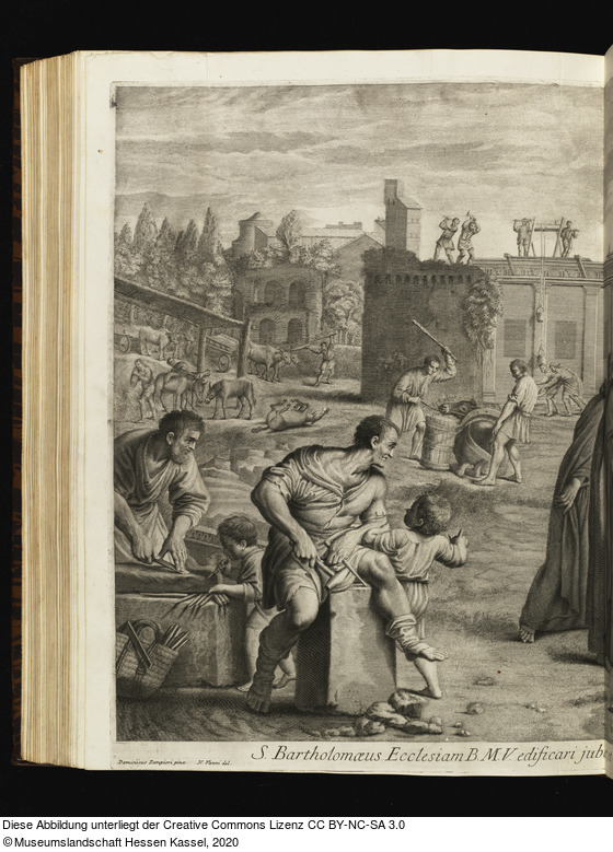 in der Platte: VI.; S. Bartholomaeus Ecclesiam B. M. V. edificari jubet, et columna decidens Monachiejus Discipuli jussu sistitur.; Dominicus Zampieri pinx.; N. Vanni del.; Petrus Antonius Pazzi sculp.;
