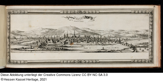 Die Ansicht von Trier weist starke Ähnlichkeiten mit dem Stich "Treveres Trier." von Matthäus Merian d. Ä. aus dem 1646 geschaffenen Werk "Topographia Archiepiscopatuum Moguntinensis, Treuirensis et Coloniensis" (S. 21-29) auf. |