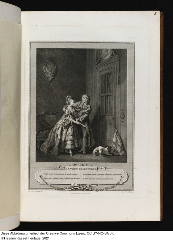 in der Platte: LA VISITE INATTENDUE. Votre indiscretion, funeste ... sur les yeux.; I. H. E. inv. S. Freudeberg del.; Voyez l'Aine Sculp. 1774.; A Paris chés Buldet rue de Gesvres.;