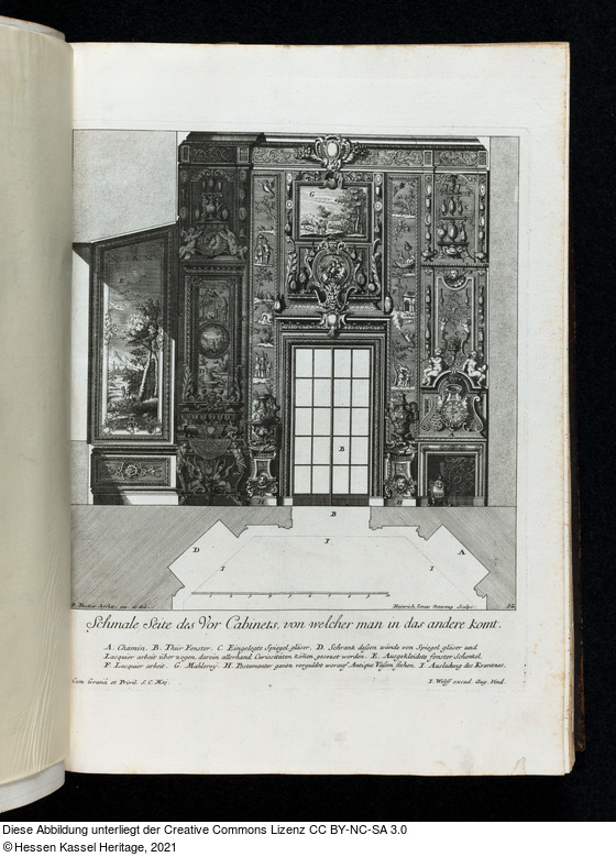 in der Platte: P. Decker Archit. inv. et del.; Heinrich Ionas Ostertag Sculps.; 32.; Schmale Seite des Vor Cabinets, von welcher man in das andere komt.; A. Chamin. ... Ausladung des Krantzes.; Cum Gratiâ et Privil. S. C. Maj.; I. Wolff excud. Aug. Vind.;