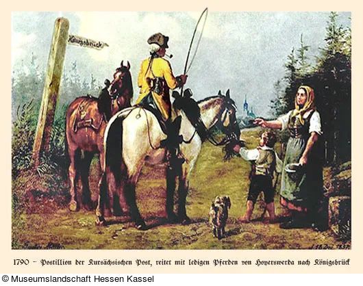 Den entscheidenden Hinweis auf die wohl korrekte Deutung der Gruppe gibt das Posthorn, das der gelb Bekleidete trägt. Unter dem Stichwort „Post“ unterscheidet Zedlers Universallexikon im Jahr 1741 zwischen dem „General-Postmeister“, der die Oberaufsicht führt, den „Verwalter-Postmeistern“ in den einzelnen Orten und den einfachen "Boten-Postilions, oder Post-Knechten“ (Bd. 28 (1741), Sp. 1787). „Diese tragen ein Zeichen oder Schild an dem Kleide auf der Brust, daran sie erkannt werden und führen ein Post-Horn an der Seite, mit welchem sie die, so ihnen entgegen kommen, warnen auszuweichen, welches ein ieder zu thun schuldig ist." (ebd.). Als Signalinstrument war das Posthorn dem Postillion somit fest zugeordnet.