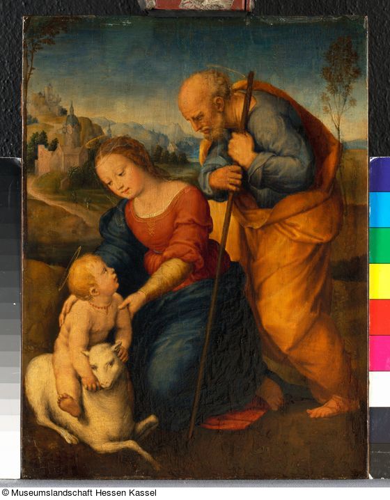 Eine von mehreren zeitgenössischen Kopien nach einer Komposition Raffaels aus der Florentiner Zeit. Bisher wurde das 1507 datierte Exemplar in Madrid (Prado, Nr. 296) als Vorlage angesehen, jedoch hat GK 539 in einigen Details - rahmende Bäume im Hintergrund, Nibus über Josephs Haupt - auch spezifische Gemeinsamkeiten mit der bereits 1504 entstandenen Version in Münchner Privatbesitz (Holz, 32 x 22 cm, bez. RAPHAEL VRBINAS AD MDIV; aus Slg. Viscount Lee of Fareham). Dieses Bild wird in der jüngsten Forschung als originale Urfassung betrachtet (Meyer zur Capellen; s. auch L.D. u. H. S. Ettlinger, Raphael, Oxford 1987, S. 58, 62; C. Pedretti, Raphael, Florenz 1989, Taf. 11).