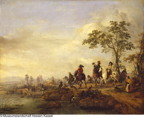 Eine Jagdgesellschaft mit einem Falkner bewegt sich auf ein vornehmes Landhaus in der Ferne zu. Der Bildinhalt spricht die am Adel orientierten Idealvorstellungen des wohlhabenden Bürgertums an. Seit der Mitte des 17. Jhs. konnte es sich Landsitze der dargestellten Art in zunehmendem Maß leisten, aber die Falkenjagd als typisch höfische Jagdform mußte ein Wunschtraum bleiben. Jagddarstellungen spielen eine zunehmende Rolle im Spätwerk Wouwermans. GK 341 dürfte wegen der relativ schlichten Inszenierung noch aus den Jahren um 1658-60 stammen.