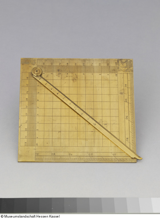 Möglicherweise verwendet zur Bestimmung des Streichens und Fallens von Schichten; auf quadratischer Grundplatte, in 10x10 Quadrate gemustert. Zur freihändigen Verwendung. Die zwei Ecken beidseitig vom Drehpunkts außen mit Skalen je von 0 bis 100, mittels Transversallinien ablesbar bis auf 1/100tel; innen für dieselbe Breite eine Nummerierung bis 10, wobei letztere der 100 auf der äußeren Skala entspricht und mit der Skala der Alhidade korrespondiert. Auf den beiden dem Drehpunkt gegenüberliegenden Ecken des Quadrats befindet sich eine Gradskaka, in 30' ausgeführt, insgesamt Teilung 1x90° im Uhrzeigersinn, die 45° dabei an der dem Drehpunkt gegenüberliegenden Ecke. Über der Grundplatte befindet sich die Alhidade, mit einer Skala von 1 bis 10; für jede Winkelstellung der Alhidade lässt der Sinus direkt ablesen und der Cosinus problemlos berechnen. Die ursprünglich wohl vorhandenen Diopter fehlen. Nicht signiert. Eingrenzung der Datierung gemäß Bramers eigenen Publikationen. Konstruktion dieses Geräts abgewandelt von dem eines üblichen, sowohl für astronomische wie für geodätische Zwecke, genutzten Geometrischen Quadrats gemäß Peurbach; wird im Prizier-Inventar von 1765 bezeichnet als 'Ein viereckigt Instrument von Meßing mit einem oben vestgemachten und sich hin und wieder schiebenden Regul zur Geographia Subterranea', wobei letzterer Terminus nicht notwendigerweise eine Anwendung untertage impliziert und sich zudem mehr auf die Nutzung dieses Instruments im 18. Jh. als auf dessen ursprünglichen Gebrauch beziehen mag. (PSch, 2018)