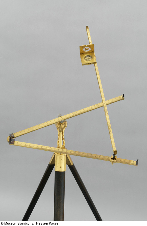 Zum geometrischen Bestimmen von Entfernungen; dies basiert darauf, dass nach der Ermittlung einer Basislinie bei der Vermessung dann nur noch winkelgleiche Dreiecke erstellt werden, wodurch an den Skalen der Visierregeln die Ablesung der Entfernung, als Verhältnis zur Basislinie, ohne trigonometrische Umrechnung möglich ist. Mit Originalstativ; dieses ist gesondert inventarisiert als I 26. Alle drei Visierregeln mit einheitlicher Längenskala, die beiden kürzeren dabei je von 1 bis 300 reichend und in Einerschritten, die längere von 1 bis 430 reichend und in Zweierschritten ausgeführt; Ablesegenauigkeit bei allen Skalen auf ca. halbe Einheiten. Auf letzterer Visierregel befindet sich eine weitere Skala, bis 90° reichend und ein direktes Ablesen des Winkels zwischen den beiden kürzeren Visierregeln ermöglichend; in 15' ausgeführt und mit einer Ablesegenauigkeit von ca. 5'. Diese Visierregel besitzt zudem ein aufklappbares quadratisches Kästchen mit Bussole, Richtungsangaben dort wie bei einem Bergkompaß mit Vertauschung von Ost und West. Die untere der beiden Grundplatten mit einer Sonnenuhr, die Bussole umschließend. Die obere, aufklappbare, der beiden Grundplatten mit einer außen in 2° ausgeführten Skala, Teilung 2x180° beidseitig, und innen mit einer korrespondierenden Skala von 2x12 Stunden. Alle Visierregeln mit Dioptern, je mit Visierschlitz und gegenüberliegendem Visierstift; nur bei der Visierregel zur Festlegung der Basislinie findet sich auf beiden Seiten je ein Visierschlitz und ein Visierstift. Ein ursprünglich wohl vorhandenes Lotpendel fehlt inzwischen. Wohl nicht signiert. Datierung basiert darauf, daß Bürgi 1602 ein kaiserliches Patent für solch ein Gerät erhalten hatte, was auf diesem Exponat auch eingraviert ist; vgl. hierzu die Ausführungen in Benjamin Bramers Publikation zum Triangularinstrument aus dem Jahre 1644. Für eine ergänzende weitere Funktionsbeschreibung siehe den nachfolgenden Text von KG. (PSch, 2018)