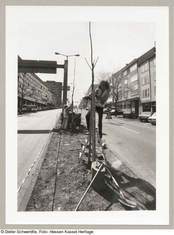 Anbinden der Bäume der Pflanzung in der Rudolf-Schwander-Straße, Fotodokumentation "7000 Eichen", documenta 7