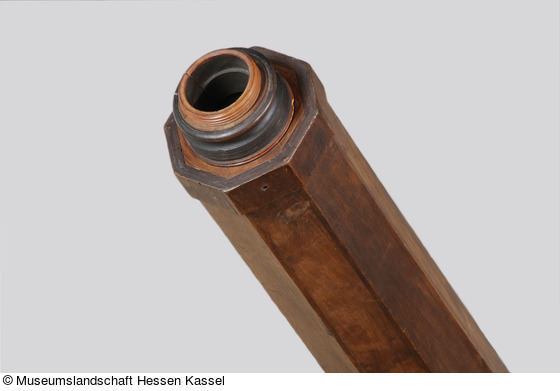 Haupttubus und Auszüge sind achteckig, aus Holz gefertigt und sind mit ehemals rot gemustertem Papier beklebt, das im Laufe der Zeit durch Lichteinwirkung verbräunt ist. Nur im lichtgeschütztem Inneren ist die einstige Pracht noch sichtbar.