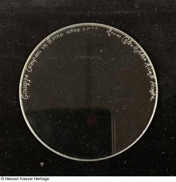 Giuseppe Campani in Rom galt um 1700 als einer der besten Hersteller von optischen Instrumenten. Er stellte Teleskope mit großen Brennweiten zwischen vier und neun Metern her, von denen im Februar 1700 Landgraf Carl von Hessen-Kassel (1654-1730) bei seinen Besuchen in Campanis Werkstatt unter anderem eines für 30 Doppien kaufte. Das Teleskop F 343 passt mit seiner Brennweite von etwa fünf Metern in diese Kategorie. Carl wird es als Erweiterung seiner Sammlung leistungsstarker Teleskope erworben haben, ebenso wie das in der Sammlung erhaltene Campani-Luftteleskop F 184, das eine Brennweite von über 32 Metern hat.