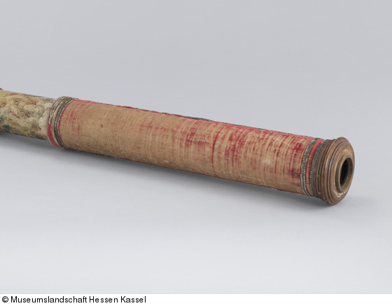 Häufig erleiden Teleskope das Schicksal, dass sie im Lauf der Zeit ihre Linsen verlieren. Diese werden entnommen und in andere Instrumente eingesetzt. Meist können sie nicht mehr wiedergefunden werden. So ist es auch bei diesem Teleskop geschehen. Im Inventar von 1765 sind alle Linsen und "Deckel" als fehlend aufgeführt. Die Qualität der Linsen schien sehr gut gewesen zu sein, denn die Brüder Uffenbach beschreiben dieses Teleskop als „eines der besten“ der Sammlung. Als sie es 1709 besahen, war es im Gegensatz zu den anderen Teleskopen nicht in einem Schrank gelagert, sondern auf einem Stativ montiert. Es schien zu dieser Zeit also häufiger genutzt worden zu sein. Die Identifizierung fällt durch die ungewöhnliche Samtbespannung auf dem äußersten Tubus leicht. Was mit den Linsen geschehen ist, bleibt leider unbekannt.