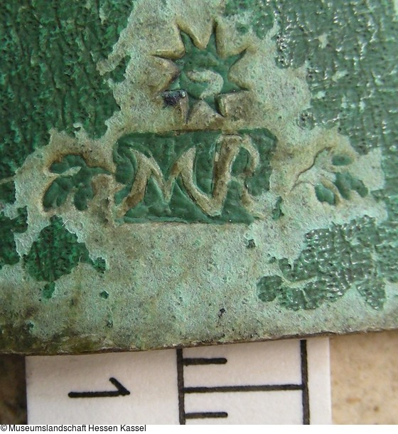 Signatur: im Rechteck mit seitlich begleitenden Blättern: MR;