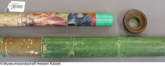 Ein vierlinsiges Fernrohr mit fünf Auszügen, hergestellt von Christian Mur und Johannes Sterr zwischen 1711 und 1721. Die Tubi sind aus Pappe mit Papier bezogen, der Haupttubus mit grünem Leder oder Pergament. Auf dem zweiten Foto ist die Signatur von Christian Mur und dessen Schwiegersohn Johannes Sterr abgebildet. Sie ist in das Leder des Hauptubus eingeprägt und befindet sich an der Kante zum nächst kleineren Tubus. Das dritte Foto zeigt die durch Lichteinwirkung verloren gegangene, ursprüngliche Farbigkeit des Bezugpapiers. Okular und Objektiv sind in Holz gefasst. Bereits im Inventar von 1816 ist F 285 in einem Konvolut von 30 "Perspectiven" als beschädigt eingetragen.
