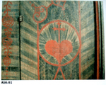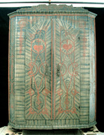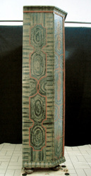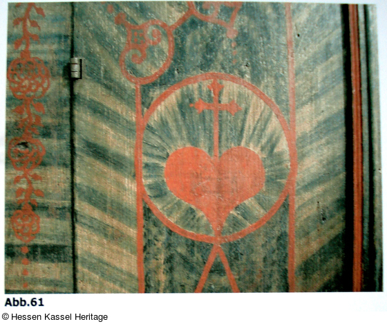 Grundfarbe helles Grün, darauf parallele Streifen aus dunklerem Grün, über allem zinnoberfarbene Linien, Kreise, Halbkreise mit gerollten Enden, Blütenbänder und Herzen (auf linker Tür mit Kreuz darüber) auf den Türen, auf den Rahmenbrettern Blüten und Rankenwerk, auf den schrägen Brettern ebenso und zusätzlich mit sich überschneidenden Halbkreisen, auf den Seitenwänden längliche Felder mit Halbkreisen. Am oberen Ende des Schranks eine rundum profilierte Leiste (gekehlt, getreppt, gewölbt). Oben abschließend ein mit Holzstiften aufgesetztes Brett mit Inschrift, an der oberen Längsseite mit Bögen profiliert.
