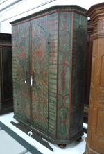 Aus zwei verriegelten Hälften bestehender Schrank aus Nadelholz mit abgeschrägten vorderen Ecken, zwei oben geschwungen gestalteten Türen und vier abgeflachten Kugelfüßen; auf dem profiliert ausgesägten Abschlussbrett oben rote Inschrift: "Maria Geilerin 1780"; Fassung in hellem Grün mit dunkelgrünen Streifen, darüber zinnoberroter linearer und floraler Dekor, auf den Türen je ein rotes Herz, das linke ein Herz Jesu mit einem daraus entspringenden Kreuz, das rechte ein Herz Mariens.