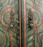 Türen aus oben und unten innen gegrateten Brettern, sie bilden oben einen Bogen; oberhalb der Türen entsprechend bogenförmig geschnittene Bretter, sie sind gespundet und mit den Rahmenbrettern durch Nut verbunden; in der Mitte besitzen beide eine Nut und sind mittels einer Feder verbunden; unterhalb der Türen zwei genauso verbundene Bretter, auf der rechten Tür eine breite, profilierte Anschlagleiste.
