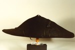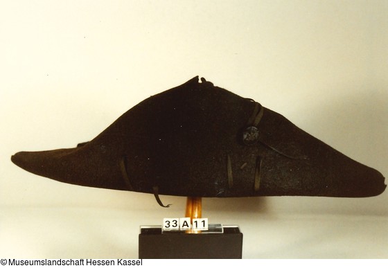 Halbrunder gesteifter Kopf mit breiter Krempe, vorne zur Spitze gebogen, mit Bändern in Form gehalten, rückseitig gerade, vorne links vierfache Bandgarnitur mit leinenumsponnenem Zierknopf. Hutband mit langen Enden aus Reliefsamt mit stilisiertem Granatapfelmotiv und verzierter Schnalle.