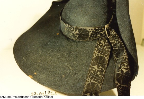 Halbrunder gesteifter Kopf mit breiter Krempe, vorne zur Spitze gebogen, mit Durchzugskordel und Bändern in Form gehalten, rückseitig gerade, vorne links Samtbandgarnitur mit langen Enden und Zierknopf. Hutband mit verzierter Schnalle. Hutband aus Reliefsamt mit stilisiertem Nelken- und Rankenmuster. Kordel schwarz. Originales Filzfaservlies vorne hinter der Krempe erhalten.