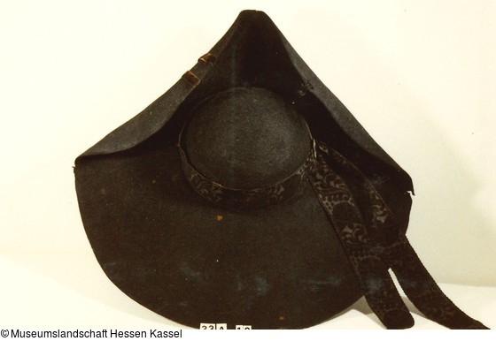 Halbrunder gesteifter Kopf mit breiter Krempe, vorne zur Spitze gebogen, mit Durchzugskordel und Bändern in Form gehalten, rückseitig gerade, vorne links Samtbandgarnitur mit langen Enden und Zierknopf. Hutband mit verzierter Schnalle. Hutband aus Reliefsamt mit stilisiertem Nelken- und Rankenmuster. Kordel schwarz. Originales Filzfaservlies vorne hinter der Krempe erhalten.