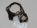 2 Paar braune Bänder, aus einem Stück geschnitten, unten in eine längliche Dreiecksform mit bogenförmig ausgeschnittenen Rändern auslaufend; Perforierung in regelmäßigem Lochmuster.
