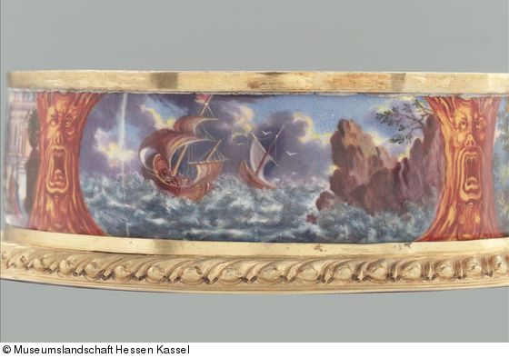 Zu den kostbaren und repräsentativen Augsburger Emailgeschirren gehört auch das kunstvoll gearbeitete Teeservice in Kassel, laut Inventareintrag aus dem Jahr 1827 (Inventar Völkel 1827, BII, Nr. 407) ein Geschenk König Georgs II. von England und Kurfürst von Hannover (1683–1760) an Landgraf Wilhelm VIII. von Hessen-Kassel. Der Austausch von Geschenken war unter den europäischen Fürstenhöfen der Frühen Neuzeit ein fest etabliertes und unverzichtbares Mittel der politischen Kommunikation. Denn prestigeträchtige Geschenke dienten nicht nur der Ehrung des Beschenkten, sondern immer auch dem Ansehen des Schenkenden. Der konkrete Schenkungsanlass des Kasseler Teeservices ist heute unbekannt, doch werden zwei Gelegenheiten vermutet: der Besuch König Georgs II. in Kassel anlässlich der Besichtigung der hessischen Truppen im Jahr 1729 und die Heirat Friedrichs, Sohn und Nachfolger Landgraf Wilhelms VIII., mit Prinzessin Maria von Großbritannien, Tochter des englischen Königs, im Jahr 1740. Die Motive der Emailmalerei würden für letztere Gelegenheit sprechen, schmücken doch die Teekanne vier Szenen aus dem Hochzeitsgedicht „Der reisende Cupido“ von Christian Hoffmann von Hoffmannswaldau (1616–1676). Die Malereien der weiteren Serviceteile zeigen, neben Allegorien der vier Elemente und der Jahreszeiten, mythologische Szenen, arkadische Landschaften, Seestücke und Hafenansichten, aber auch Christus als guten Hirten. Die – zum intellektuellen Vergnügen der höfischen Gesellschaft – in einem subtilen Spiel aufeinander Bezug nehmenden Darstellungen scheinen thematisch frei miteinander kombiniert, verweisen jedoch alle auf das Thema des „Goldenen Zeitalters“, jenes schon in der antiken Vorstellung ideale Zeitalter ohne Krieg, Krankheit und Not, dessen Darstellung die vergoldete Servierplatte schmückt.