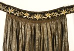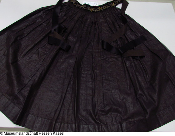 Material: Schürze: Leinen, geglänzt; Bund: Baumwollsamt mit Stickerei in Silber- und Goldfaden über Pappschablonen; Bindebänder: Halbseidenatlas;