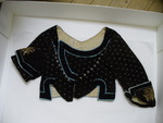 Farbe: Schürze: dunkelblau; Bund: schwarz, Stickerei: grün, lila, rosa, rot, gold und silber; Borte: schwarz, grün, lila; Band: grün.