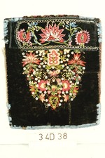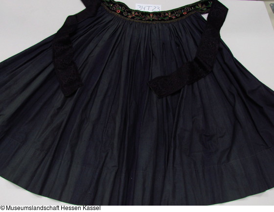 Aus zwei Stoffbahnen an den Webkanten mit überwendlichen Stichen zusammengefügt in grün mit dito Saum; Bund in Sprengtechnik mit stilisierten Blüten und Nelken bestickt und mit Borten und Band besetzt; schwarze gemusterte Bindebänder. In gehöhter Silber- und Goldstickerei auf dem Bund: "C A R H".